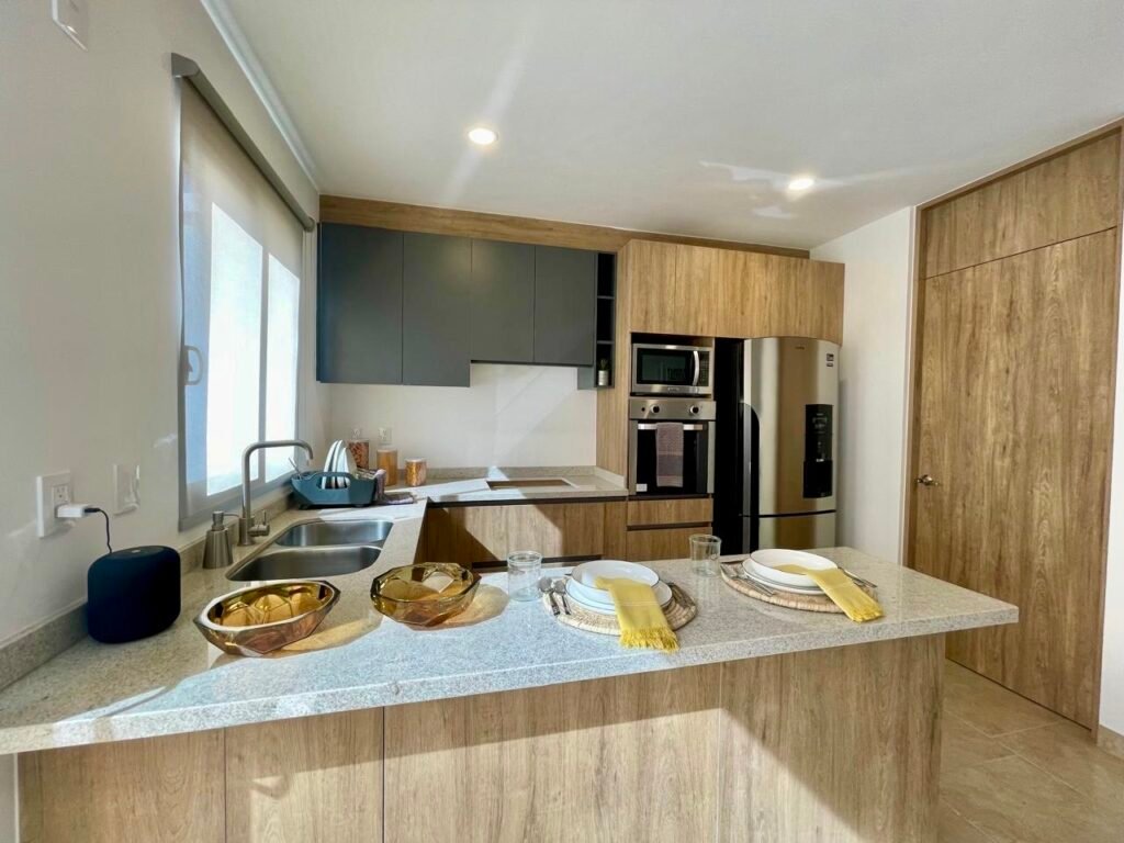 • Planta Baja: Estancia y comedor integrados, cocina equipada con elegante barra de granito, área de lavado y medio baño para visitas.