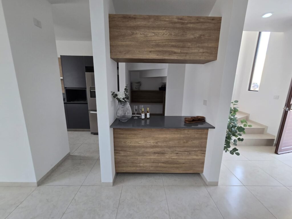 - Planta Baja: Sala y comedor integrados con armonía, cocina equipada con elegante barra desayunadora de cuarzo, bar privado, oficina funcional, jardín privado y cisterna de 2,800 litros.